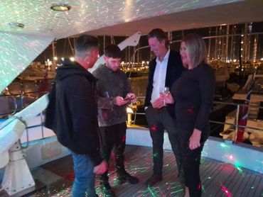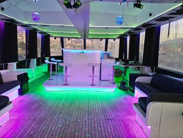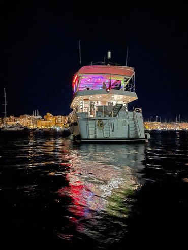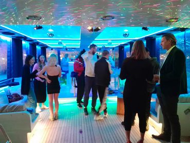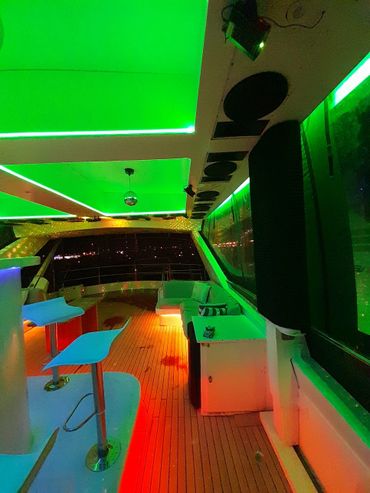 Both yachts have 5 en suite guest cabins. Lady Tatiana's party deck has full panoramic views either enclosed or fully open with 6 huge skylights exposing the deck to over 90% of the sky and surrounding views. She now has a covered entertainment area of the aft deck, saloon and party deck totalling over 80 square meters. Furthermore when coupled with Lady Alhena (her sister ship), there is accommodation for up to 20 guests sleeping on board in the 10 en suite guest cabins. The party deck as well as being huge, luxurious and comfortable, is very unique in that it has been bespoke designed by an ex-DJ and a sound engineer. The phenomenal surround sound system is driven by over 20,000 Watts of power. There is a spectacular light show on and off the party deck with lasers, mirror balls, led rope lights, spotlights, smoke machine... There is a DJ booth with a Pioneer DJ console, an Alfresco bar with luxury seating and bartender/cocktail makers enclosure.